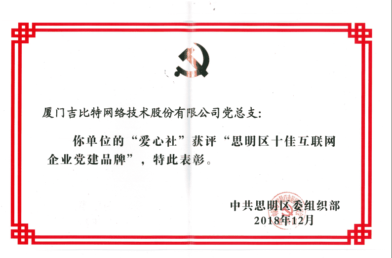 经初审评选、、、、网络评选和专家评审等环节,,,"厦门一竞技网络技术股份有限公司党总支-爱心社" 从全区28个参评党建品牌中脱颖而出,,,,获评"思明区十佳互联网企业党建品牌"。。。